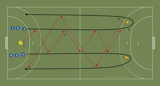 - Le gaucher commence sans le ballon et traverse à gauche derrière le droitier pour recevoir le ballon du droitier avec sa main droite.