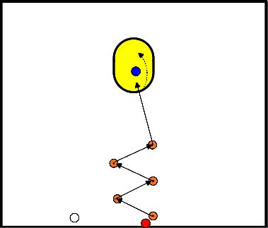 - Au moment où le joueur blanc passe le ballon au joueur bleu, le joueur blanc se déplace vers la zone libre. Le joueur bleu joue jusqu'au joueur rouge et commence à remplir l'espace libre.