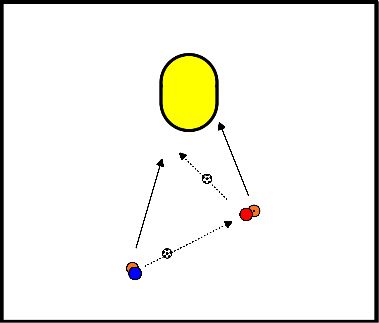 - Le joueur 1 lance le ballon au joueur 2 et court tout droit pour marquer.