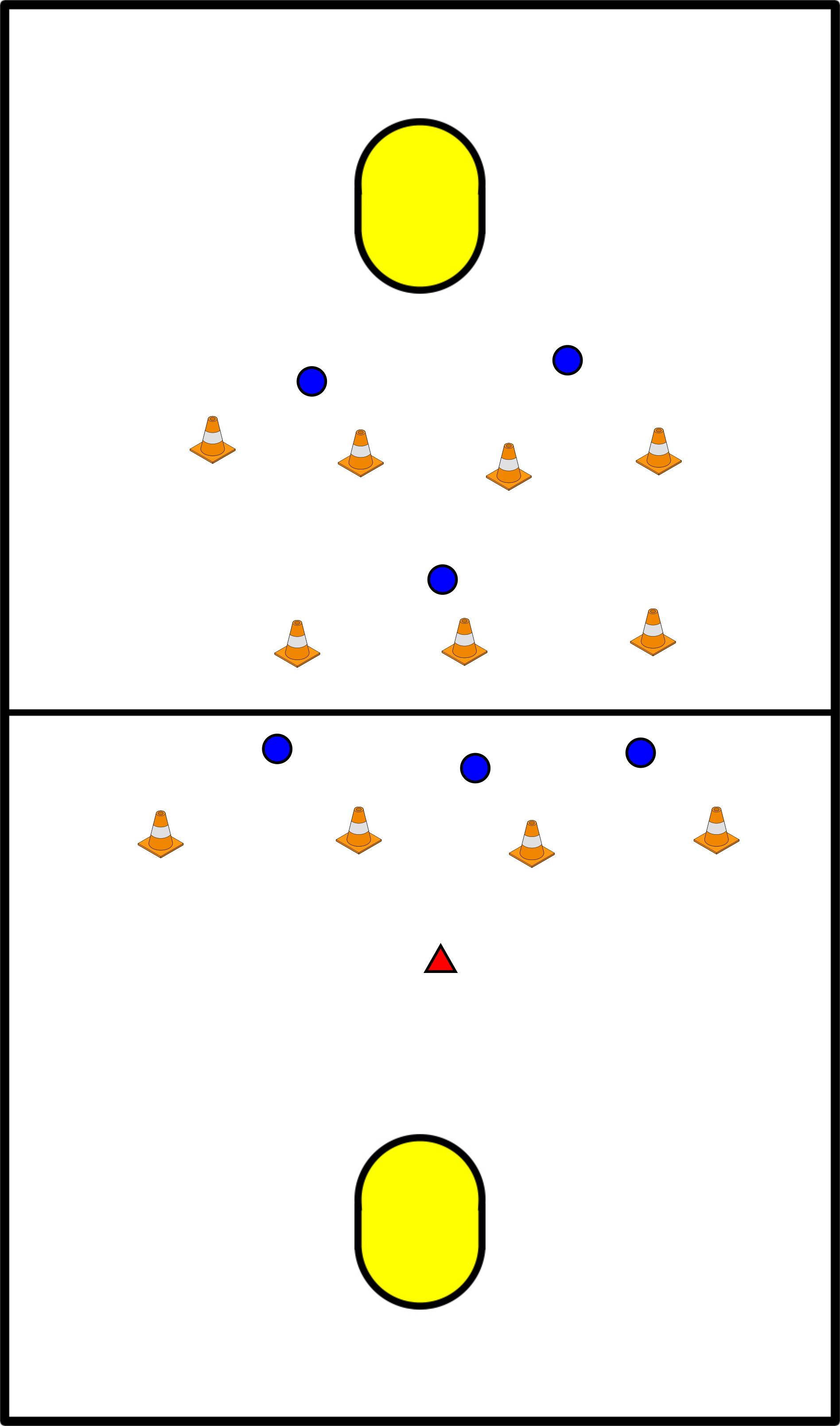 • Si cela réussit, ils retournent au bac à balles, prennent une nouvelle balle et courent vers les deux plots au milieu pour lancer à nouveau la balle dans le seau.