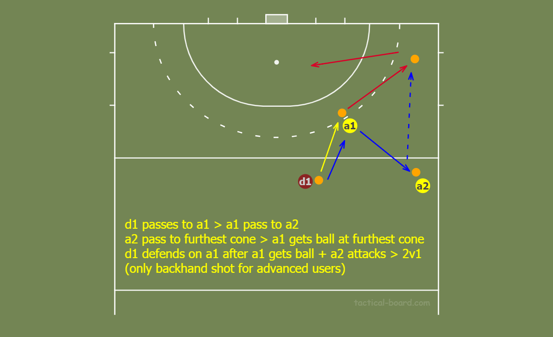 - Il giocatore 3 passa di nuovo la palla al giocatore 2 in corsa.