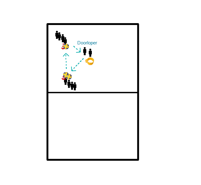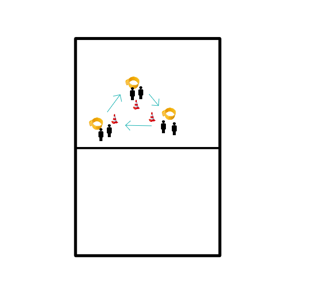 Il primo della fila corre verso il cerchio e lo attraversa dal basso, in modo che il cerchio passi sopra la sua testa. Passa poi attraverso la posizione di difesa al pedone due. Si gira e con una finta corta passa (sinistra destra) alla pedina successiva. Da lì inizia a passare la palla. Poi passa al palo per il tiro. Poi di nuovo all'inizio, tap, successivo. Si possono guadagnare due punti a persona. Vince la prima squadra con sei punti.