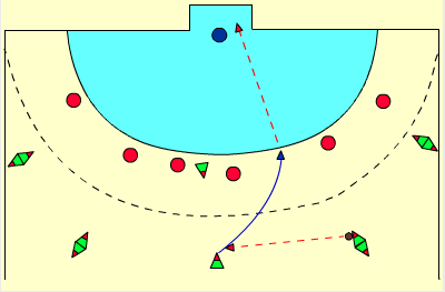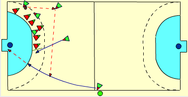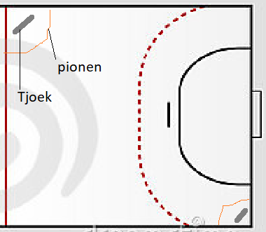 - tutti i giocatori si dividono sulla linea dei 6 metri da sinistra a destra con la palla