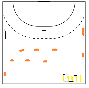 Tutti i giocatori si dividono in 2 file dietro la panchina (la panchina è sulla linea dei 9 metri).
