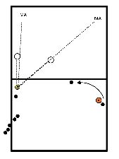 • Gli anteriori destro e sinistro che sono a rete, pronti per il blocco, corrono verso il fondo, per aiutare con il passaggio e per essere pronti per il passaggio d'attacco in corsa.