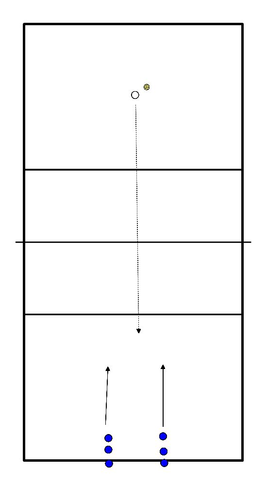 • Posizionarsi sulla linea di fondo e palleggiare in avanti verso la rete.
