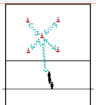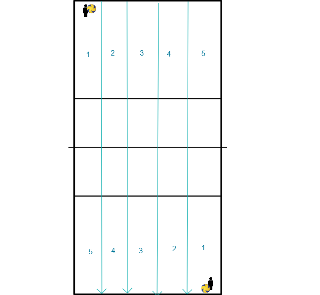 - Dall'attaccante destro, la palla viene colpita nella propria metà campo fino alla posizione 4/5. Il difensore attacca di nuovo la propria palla.