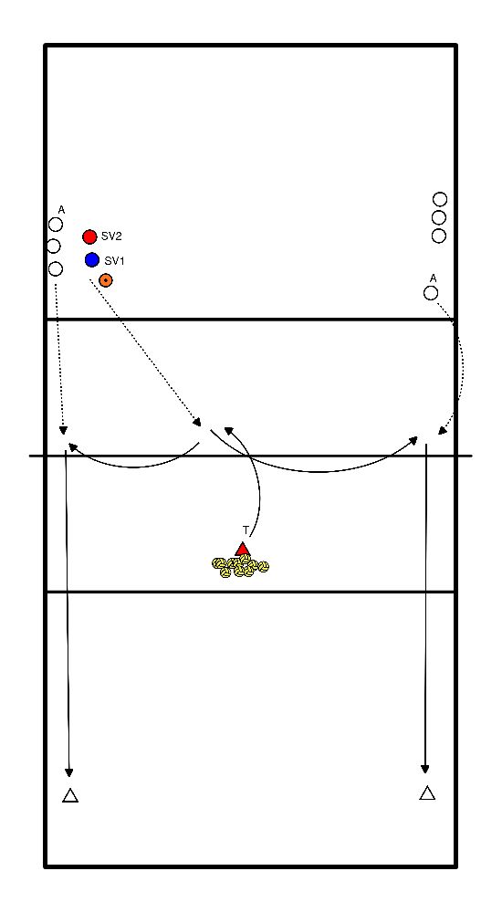 - 2 file di attaccanti dietro 3 metri sui bordi esterni, 2 x SV al centro.