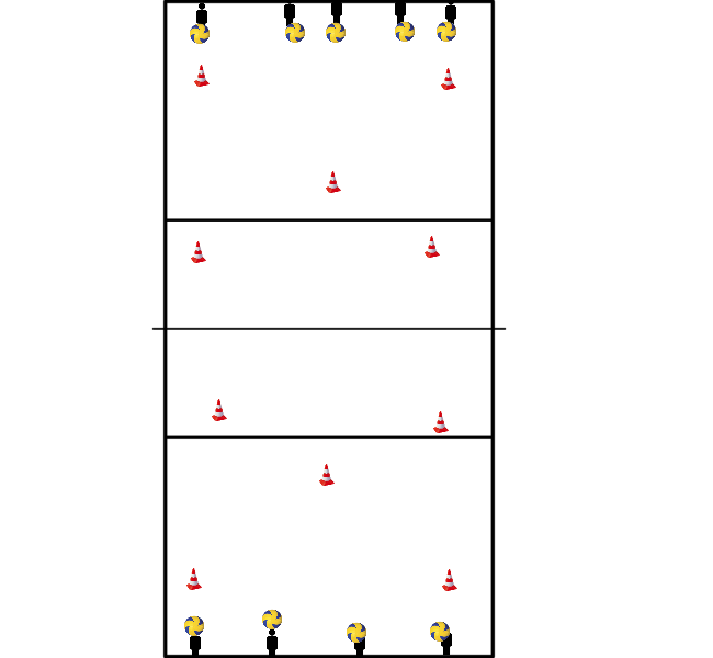 - Dopo il segnale dell'allenatore, la prima palla deve essere presa sotto mano, mentre la palla all'altro deve rimanere sopraelevata.