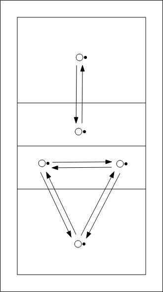 - L'allenatore serve o lancia una palla semplice alla squadra B. La squadra B attacca come da istruzioni e la squadra A difende questo attacco. Il rally viene giocato. La squadra B passa al compito successivo quando la squadra A ha segnato tre gol.