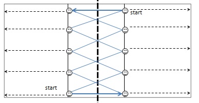 Il numero 1 inizia e si dirige verso il pedone centrale e dal centro si dirige verso gli altri pedoni come segue;