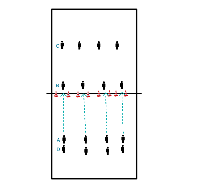 - I gruppi di due si posizionano a coppie l'uno dietro l'altro, rivolti nella stessa direzione.