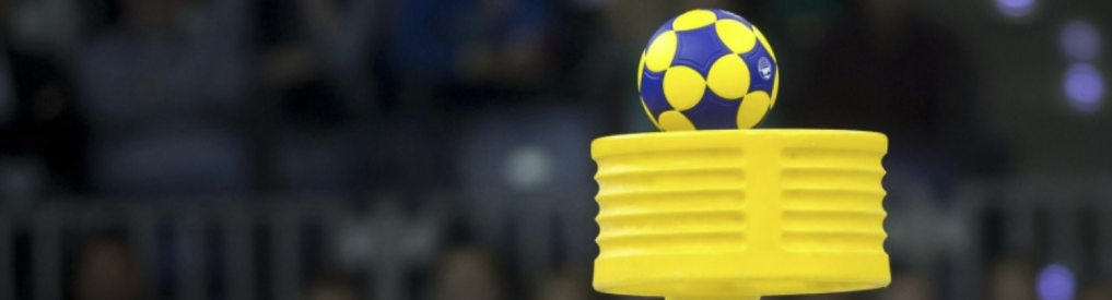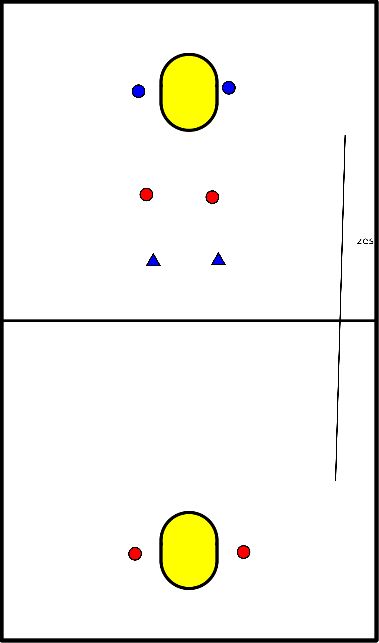 • De spelers starten met een bal in de hand en rennen naar de twee hoedjes die het dichtst bij het net staan.
