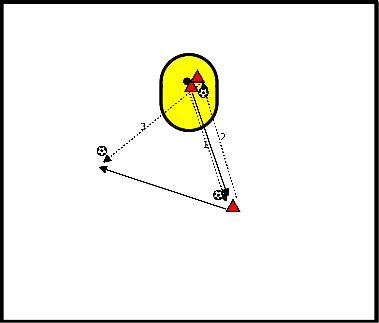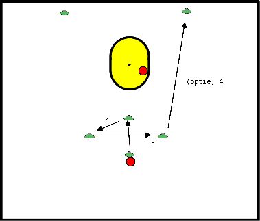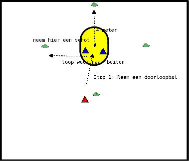• De aanvaller met bal speelt de bal naar voren en haalt hem weer op.