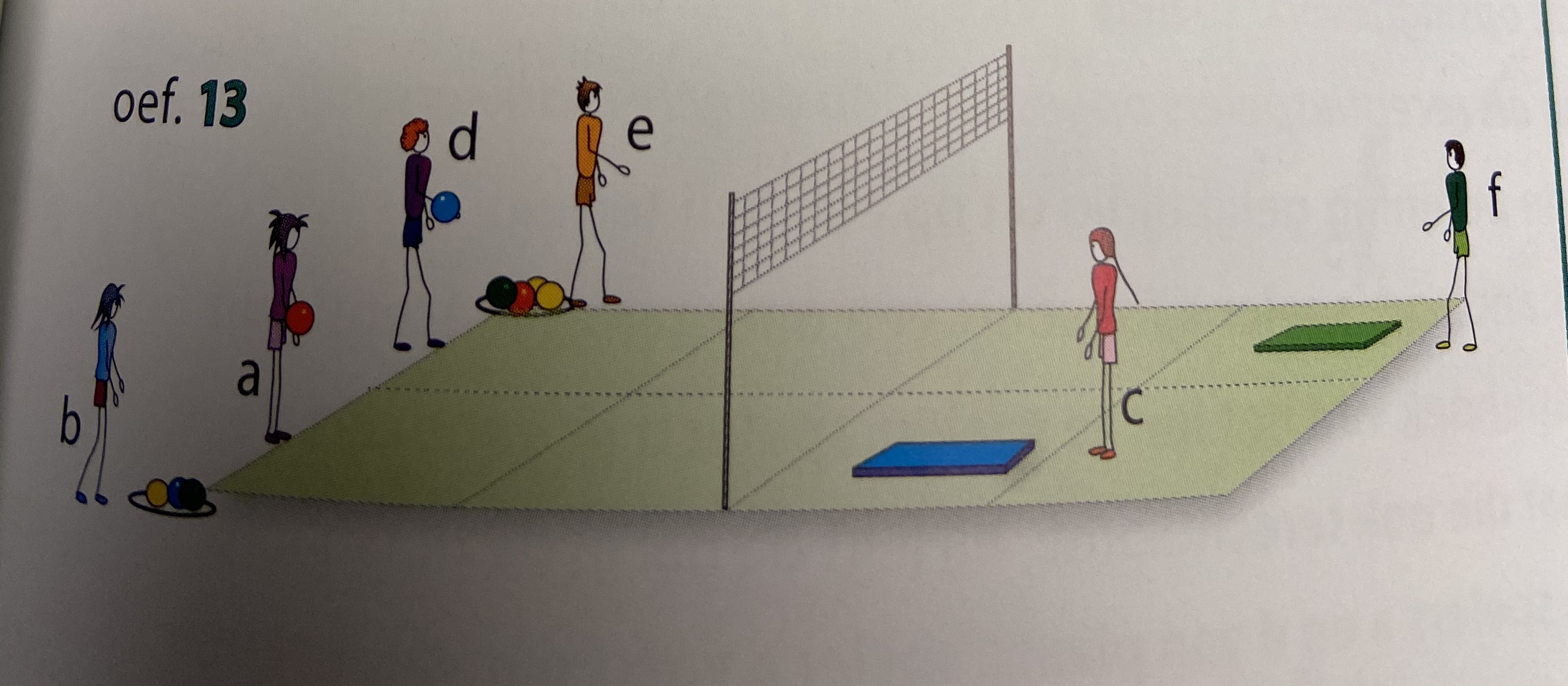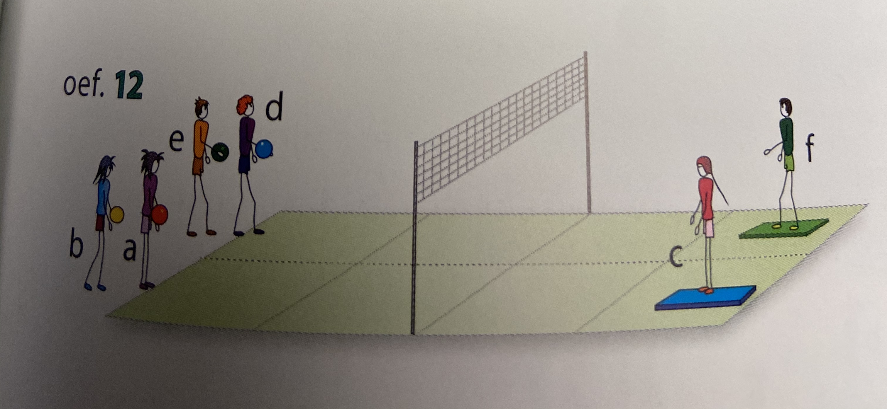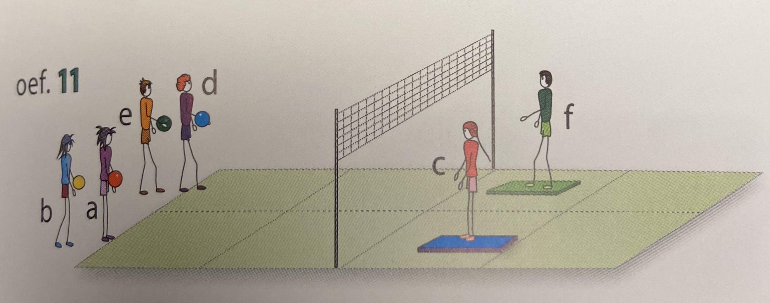 - spelers c en ef staan op een mat; spelers b en e staan achter het terrein