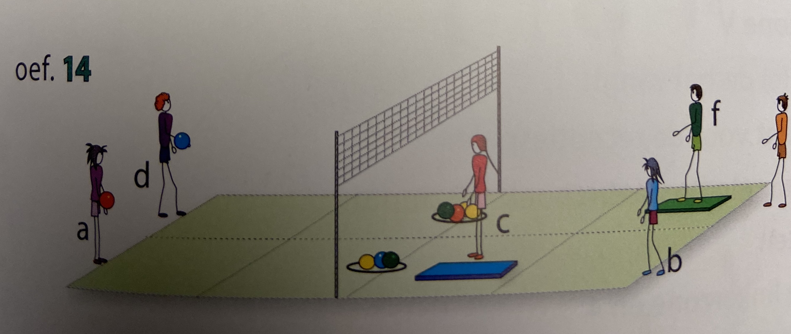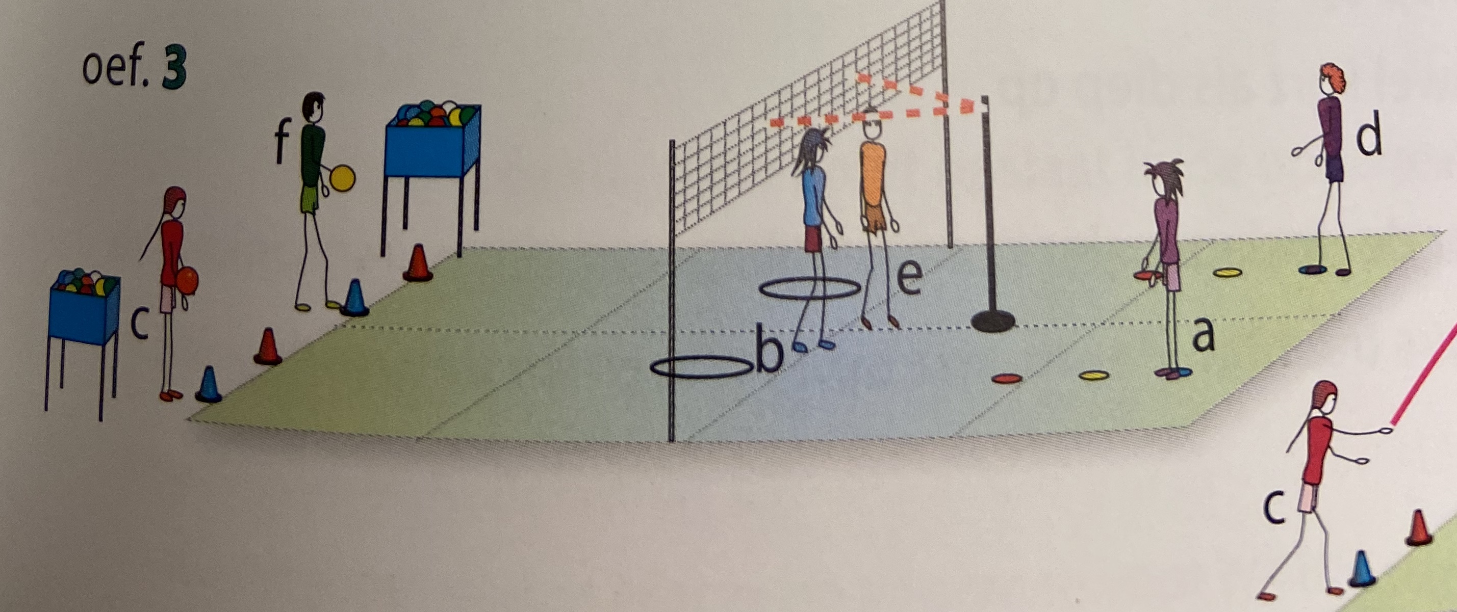 - spelers c en f staan opgesteld achter de matten ; spelers b en e staan bij de fietsband