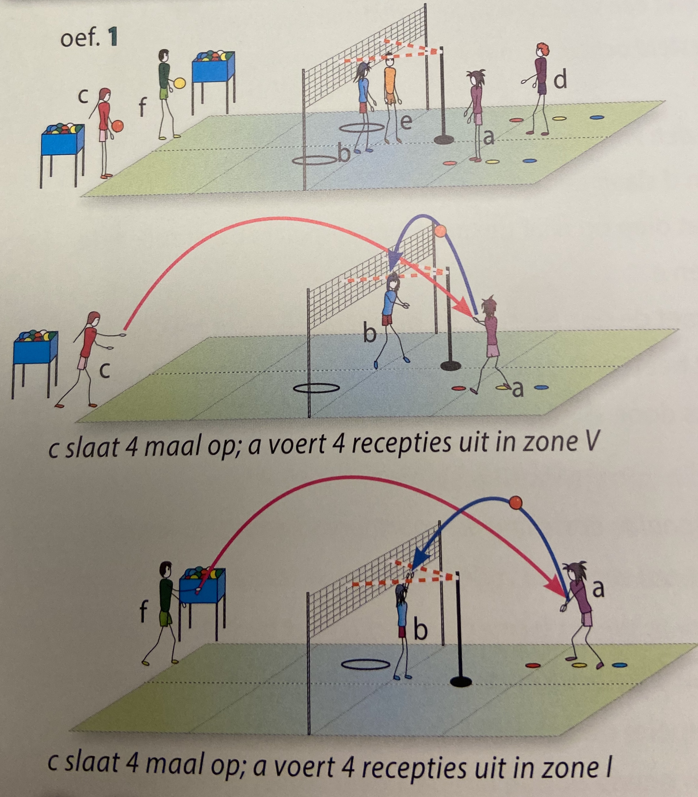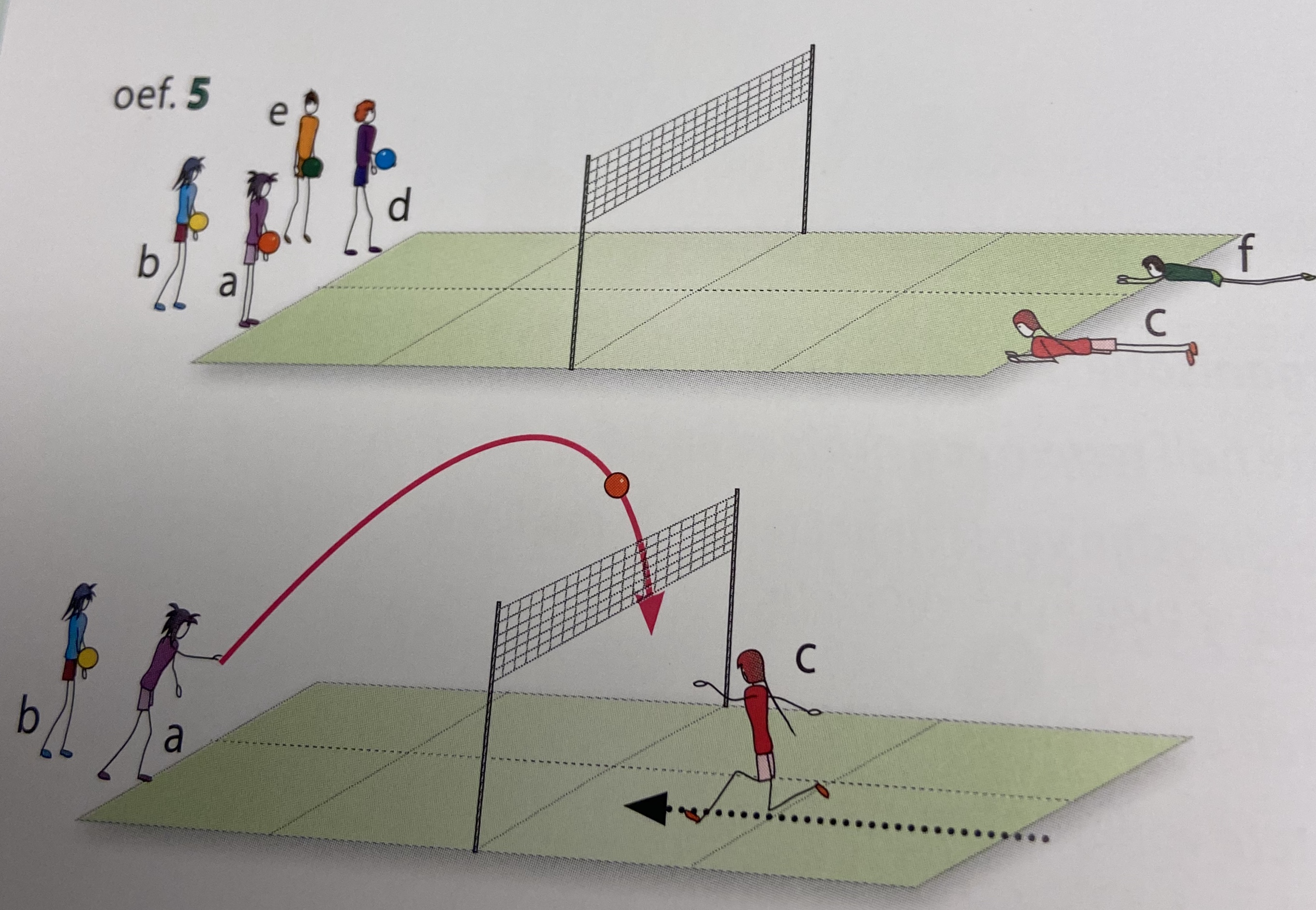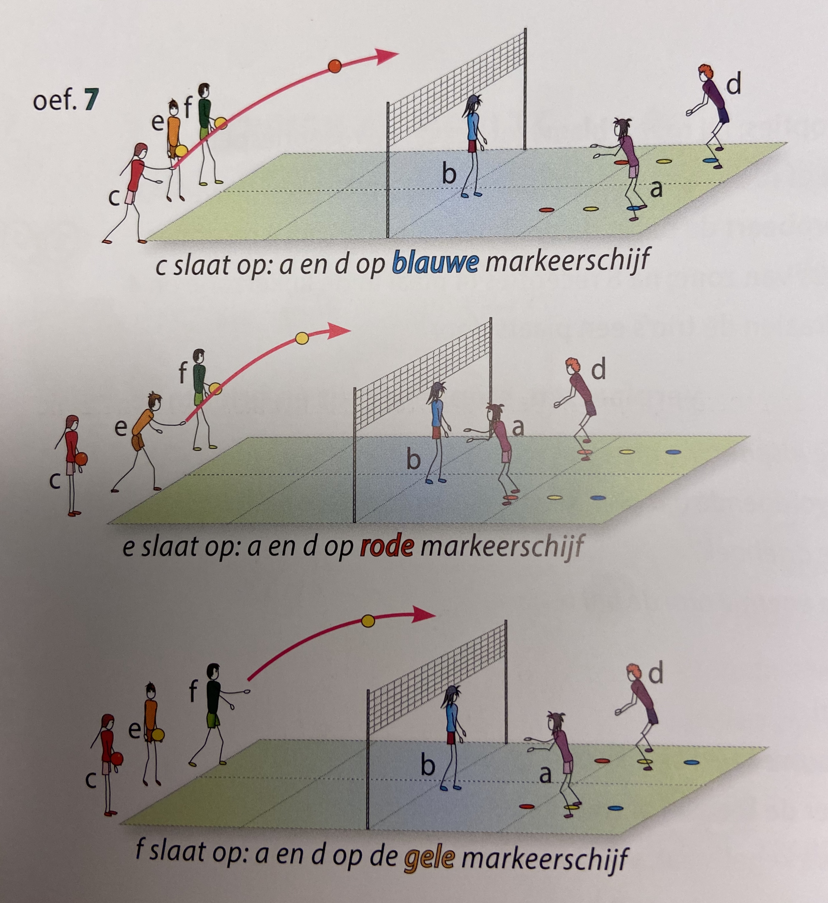 - splers c en f zijn de opslaggevers; spelers b en e staan centraal aan het net