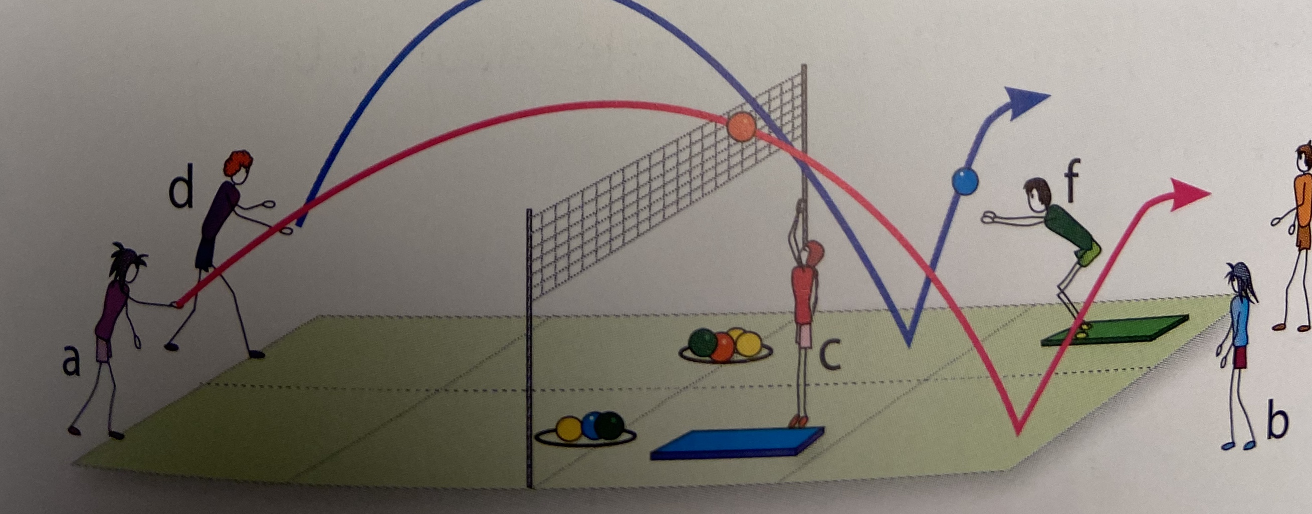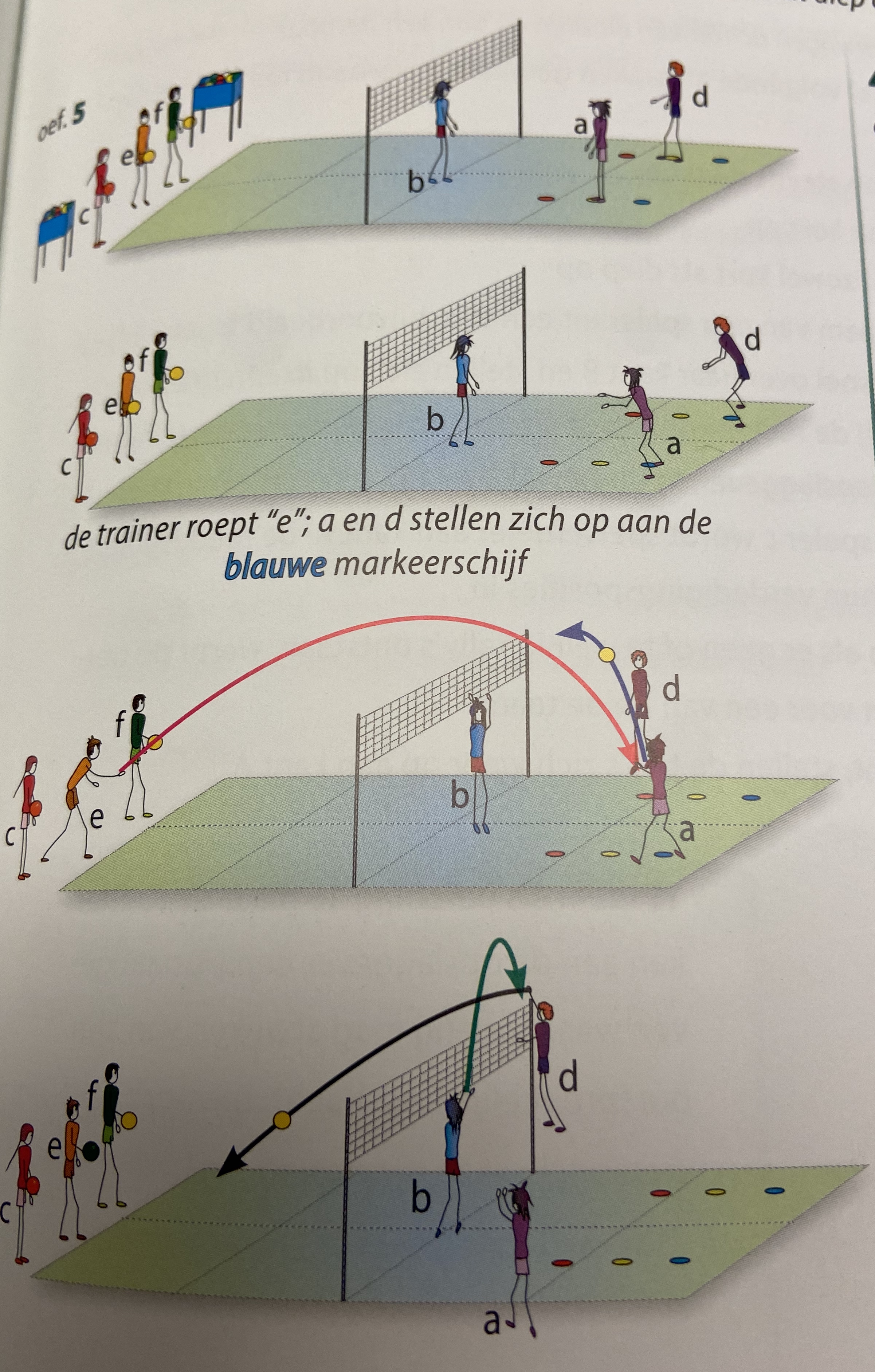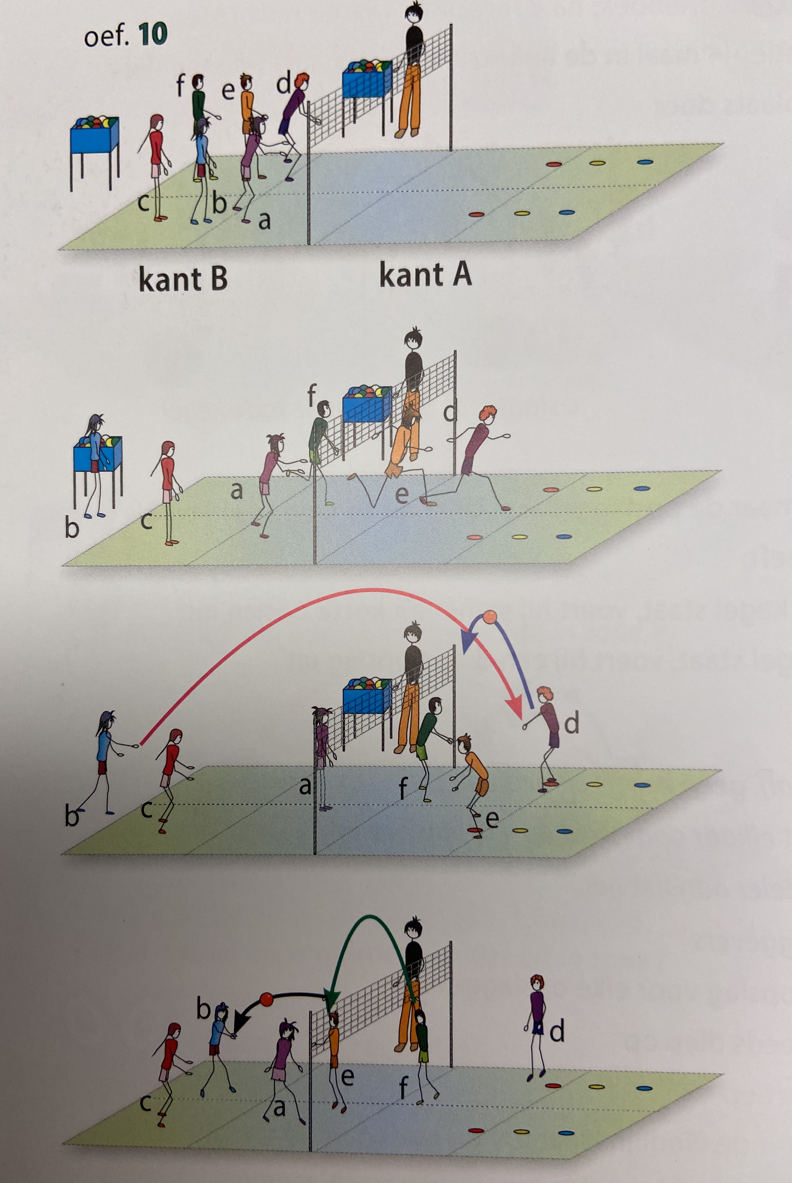 - splers c en f zijn de opslaggevers; spelers b en e staan centraal aan het net