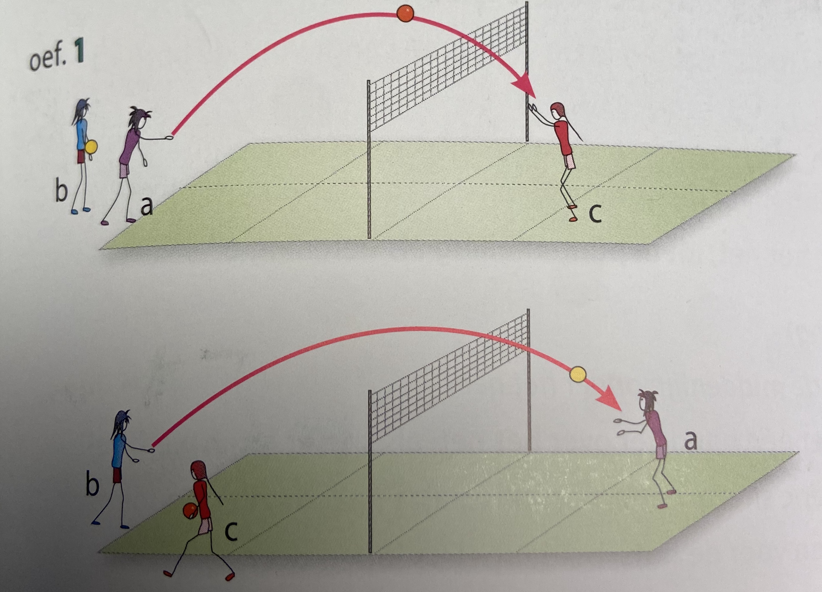 speler b werpt onderhands over het net; speler a vangt enz.