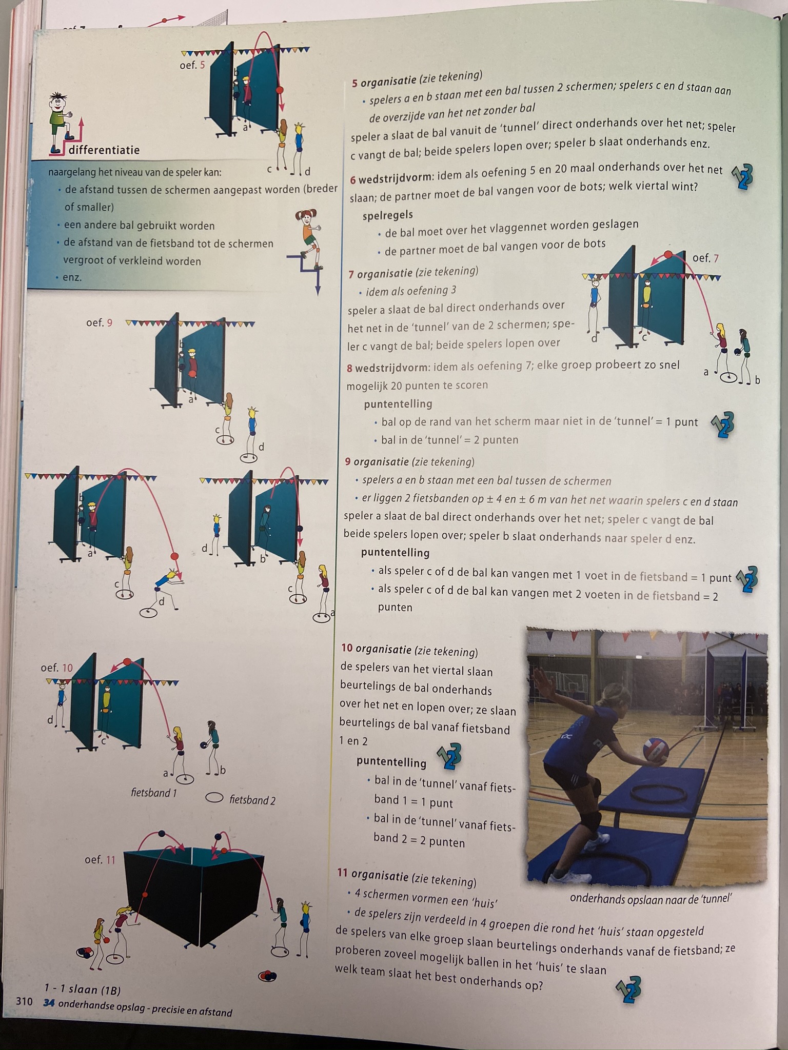 7 idem als vorige oefening maar de opslagspeler slaat de bal via een onderhandse opslag kort over het net; idem puntentelling als oefening 6
