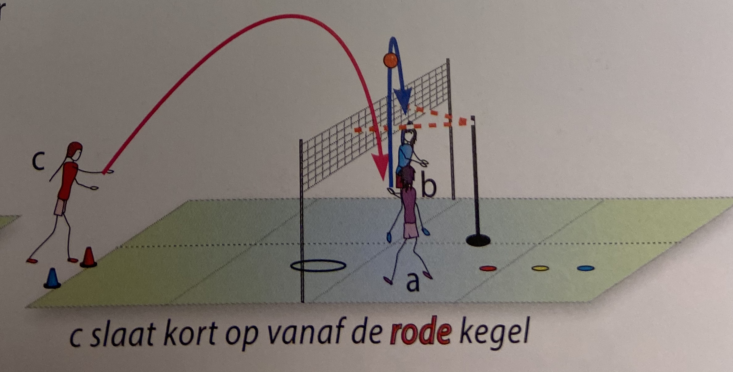 - speler c in buiklig op de middellijn onder het net