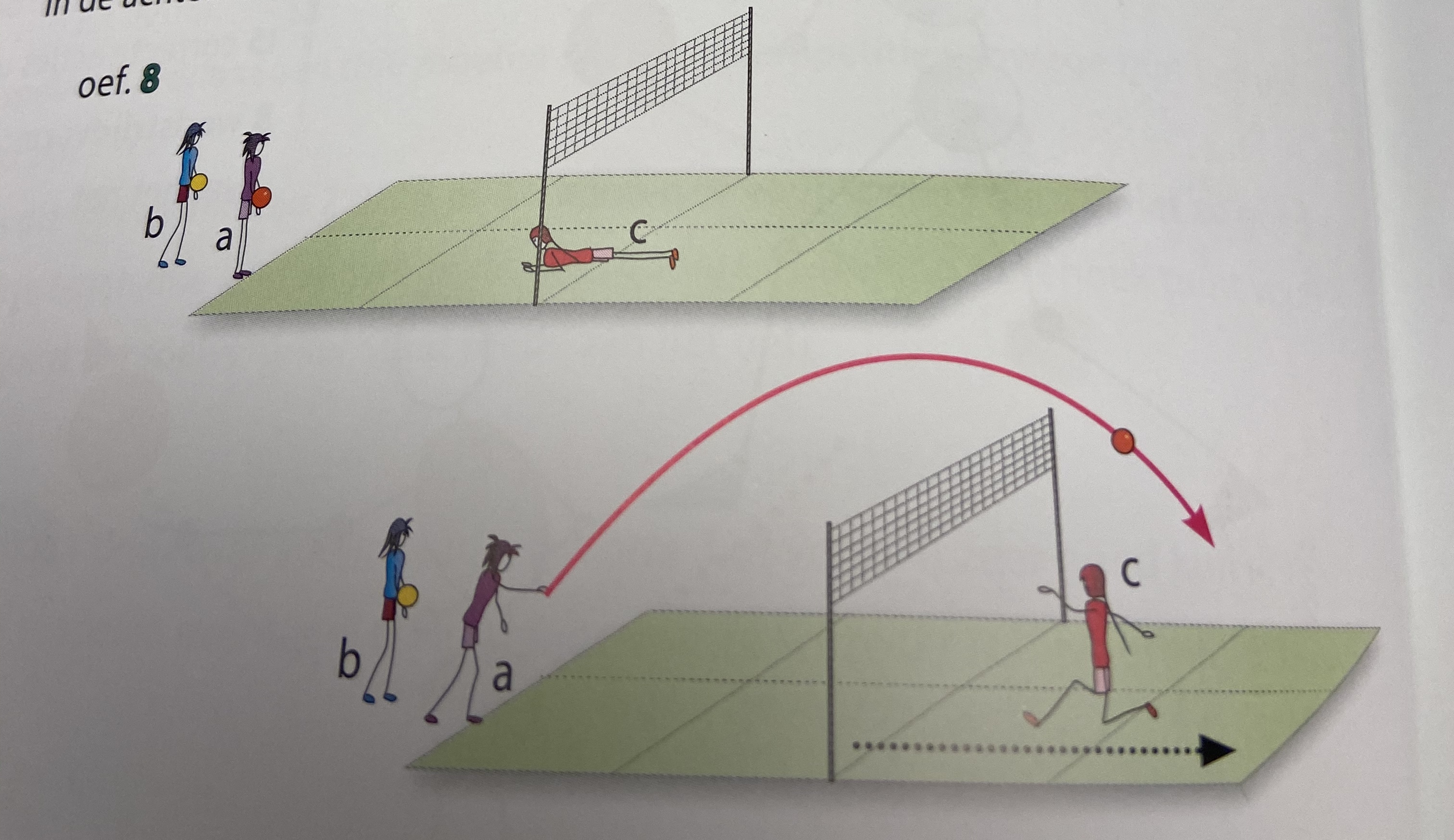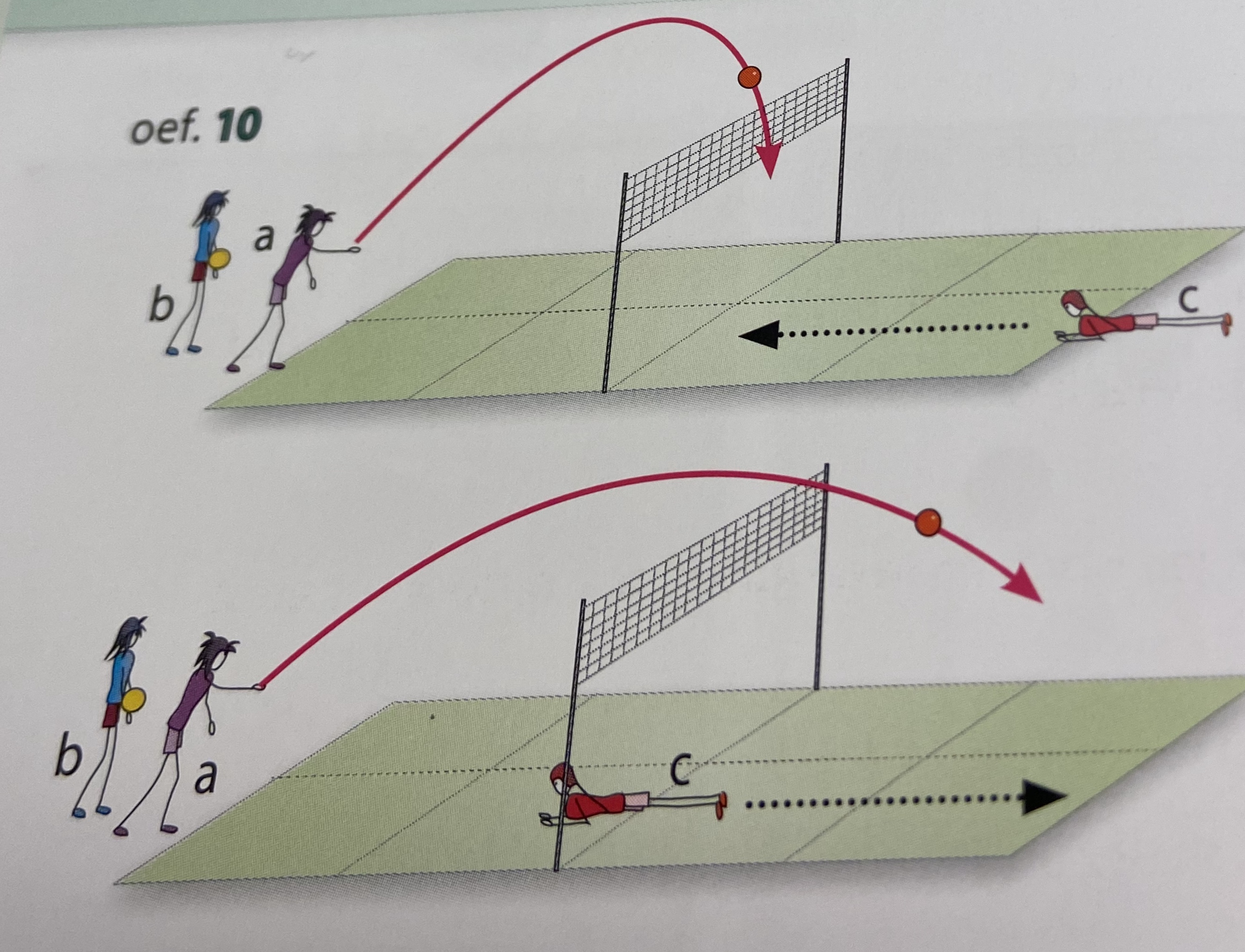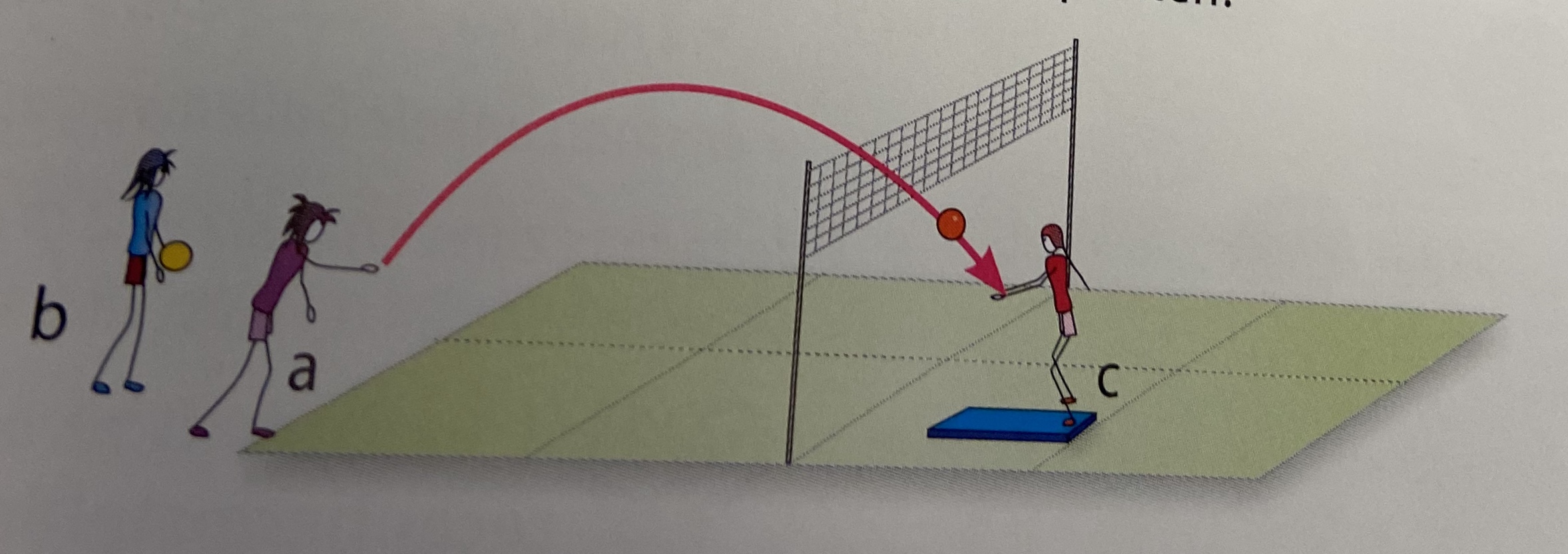 speler a werpt de bal met één hand ver over het net; als sper a zijn werpbeweging inzet; staat speler c snel , spurt achterwaarts naar de diepe zone en probeert de bal te vangen voor de bots; beide spelers lopen over