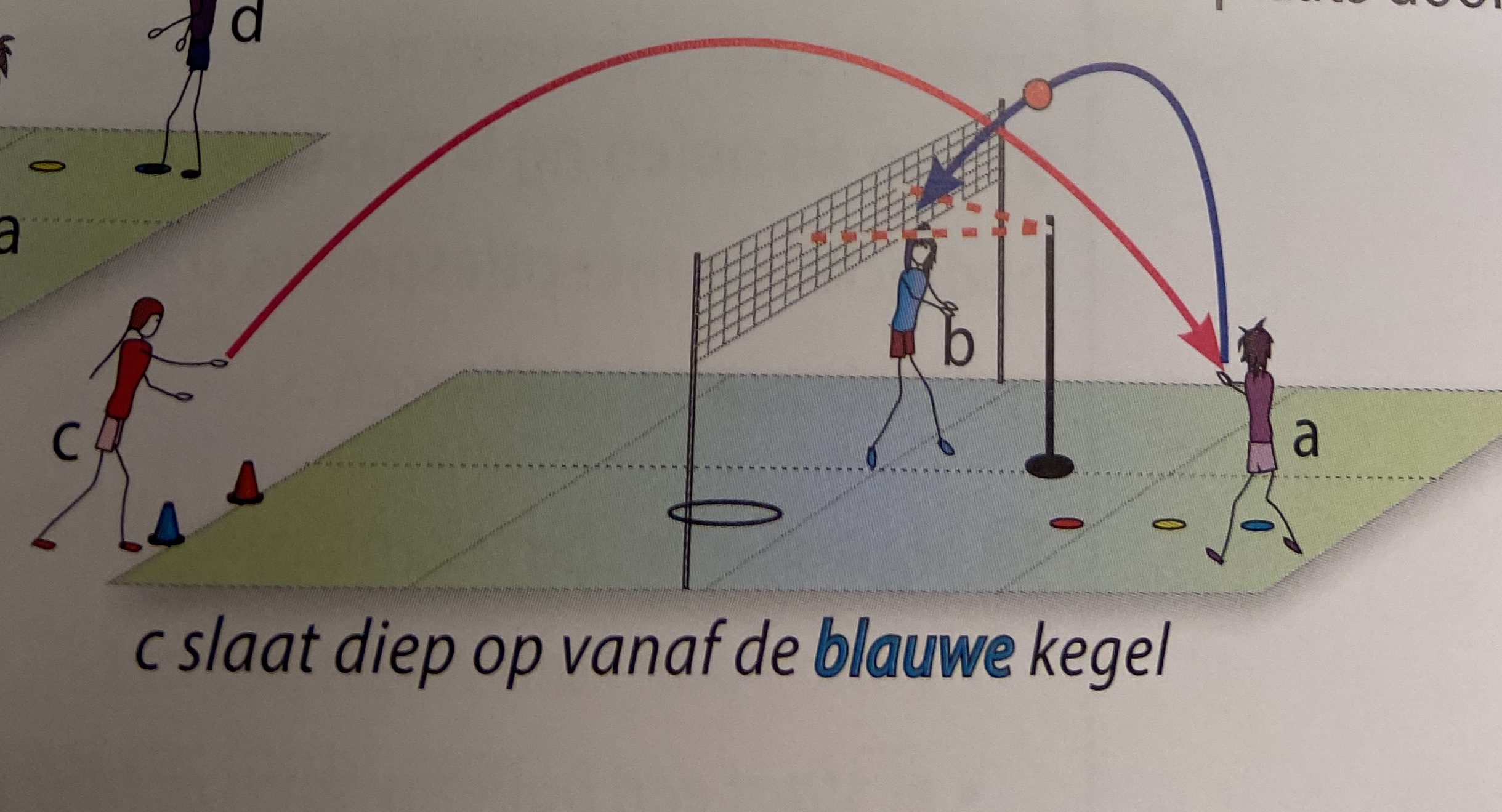 - spelers a en d staan naast elkaar ogpesteld op 4 m van het net