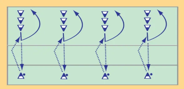 b. Aanspeelpunt speelt de bal tussen de lijnen. Voorste probeert bal te vangen
