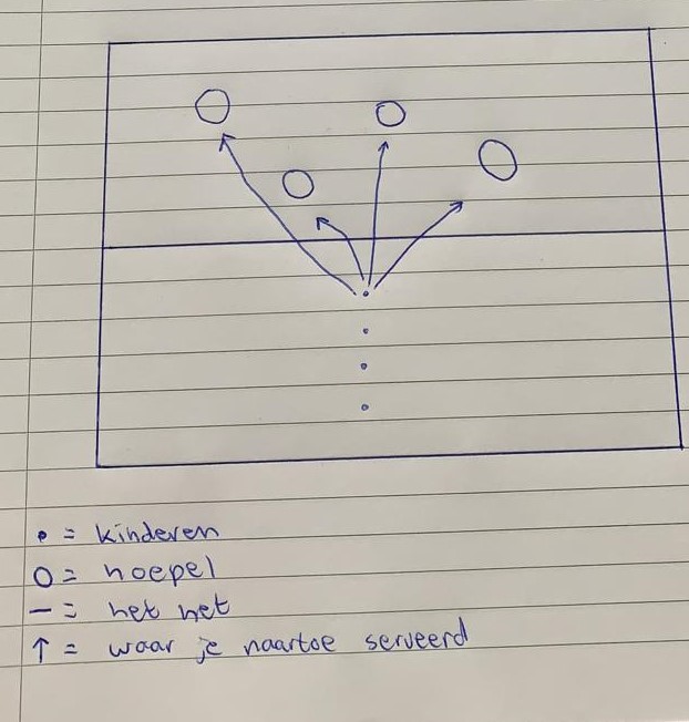 - De spelers serveren in hoepels. In de hoepel is 5 punten, er tegen is 3 punten