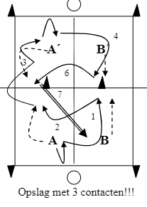 - hierna speelt speler 1 de bal naar speler 3, speler 3 speelt de bal naar de lummel, en de lummel gooit de tennis bal