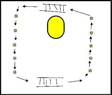Schutters draaien een korf door na 2 doelpunten. Bij de volgende korf moet het totaal dan 4 doelpunten zijn, gevolgd door 6 doelpunten etc. Tot de schutter rond is