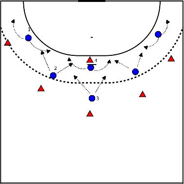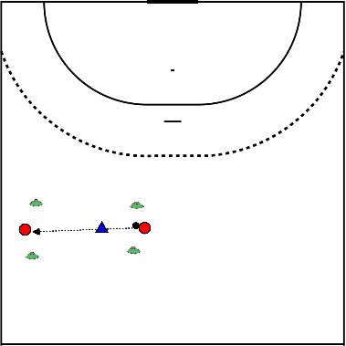 2. Rugdekking hoek, voorkomen aanspelen vd cirkel. Offensief uitstappen op de opbouw. Cirkel overnemen als bal aan de andere kant is van het spel.