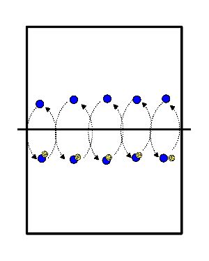 lange bal geslagen, korte bal, lange bal gegooid, korte bal, lange bal geslagen. In een M vorm. 3 rondjes pp