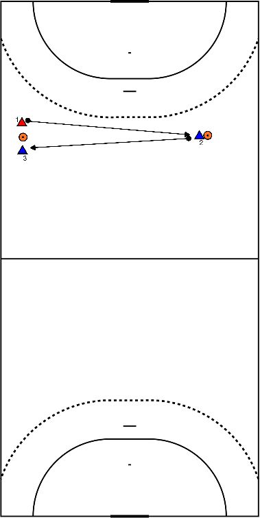- Speler 3 speelt weer de bal naar speler 1 en loopt achter de bal aan naar de overkant enz.