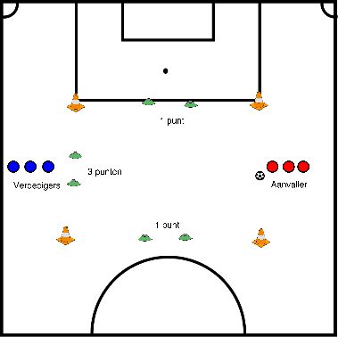 - Variatie: beperk het aantal balcontacten voor de aanvaller, veld vergroten of verkleinen, doelen vergroten of verkleinen
