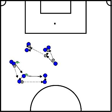 - De speler bij de volgende pion zakt uit en vraagt de bal en de speler speelt de bal in, etc.