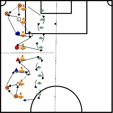 - Oranje passt de bal naar blauw, die de bal komt vragen.