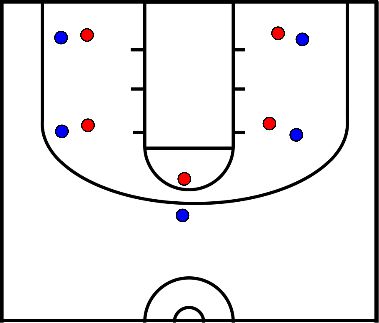 - Speler 1 met bal op de kop van de driepuntslijn (positie 1, wit).