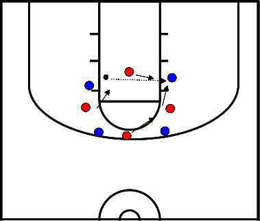 - Wit past de bal naar blauw en maakt direct een snijdende beweging naar de basket.