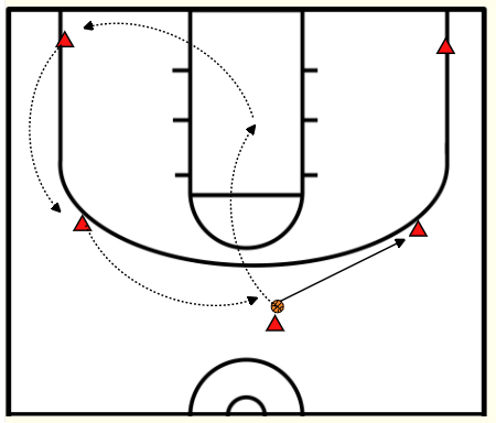 - Na de layup, gaat de passer achter in de rij aan de baseline staan.