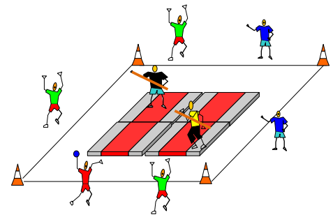 - Op de 4 kleine matjes staan 2 kinderen, die mogen afweren met een 1-meterstok.
