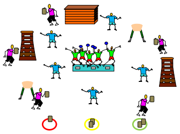 - Heb je een blok geroofd leg je deze in de hoepel bij de beginlijn en probeer je nog een blok te roven.