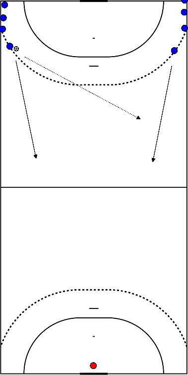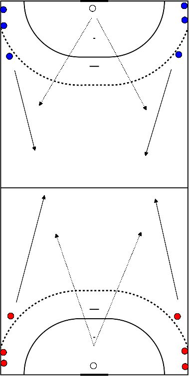 - Je loopt met 1 bal per tweetal naar de cirkel aan de overkant toe.