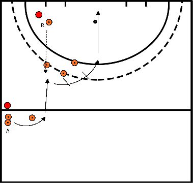 - De bal kan direct naar de stick van C worden gespeeld of als tipbal, zodat C met een tip-in kan scoren.