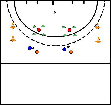 - Spelers rood en blauw staan kort bij elkaar en tikken de bal op en neer tussen de pionnen door.