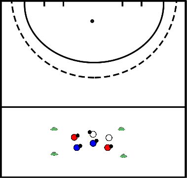- Speler rood pusht de bal naar speler blauw, speler blauw naar speler wit en speler rood 2. Spelers mogen de bal maximaal twee keer aanraken.