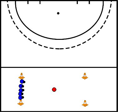 - Daar legt hij de bal klaar voor de volgende speler, die de route weer aflegt met bal en stick, enz.
