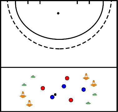 - Spelers hebben allemaal een bal en dribbelen door het vak met pionnen.