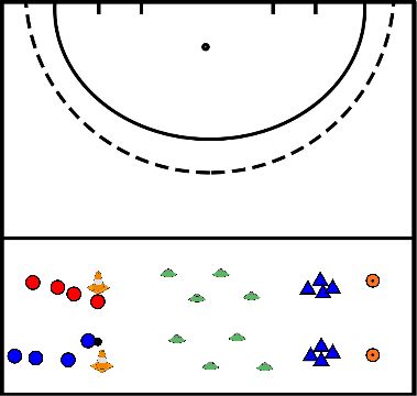 - Trainer steekt bv. een blauwe pion de lucht in --> Alle spelers proberen z.s.m. om alle blauwe pionnen te drijven.