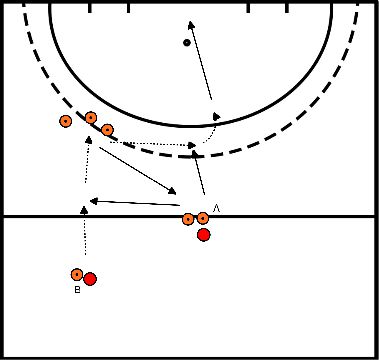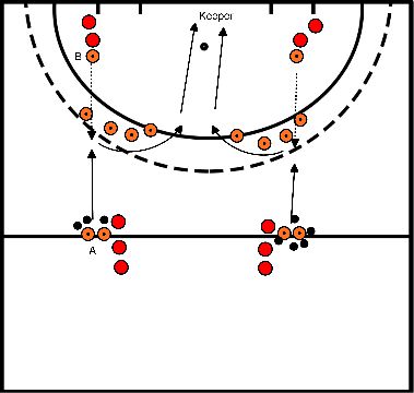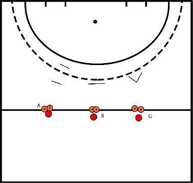 - Neemt de bal aan, loopt de cirkel binnen en schiet op doel (links op de backhand, rechts op de forehand).